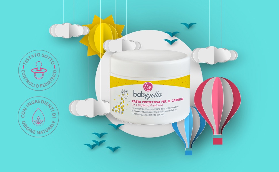 Babygella PASTA PROTETTIVA con Complesso Prebiotico, è una emulsione sviluppata per soddisfare le esigenze della cute del bambino nella delicata area del pannolino. Contiene ossido di zinco al 10% per un’azione protettiva e barriera, olio di crusca di riso per un effetto nutriente, Bisabololo ed estratto di Calendula per un’azione lenitiva, e Galatto-oligosaccaridi e Xilitolo per un’azione prebiotica.